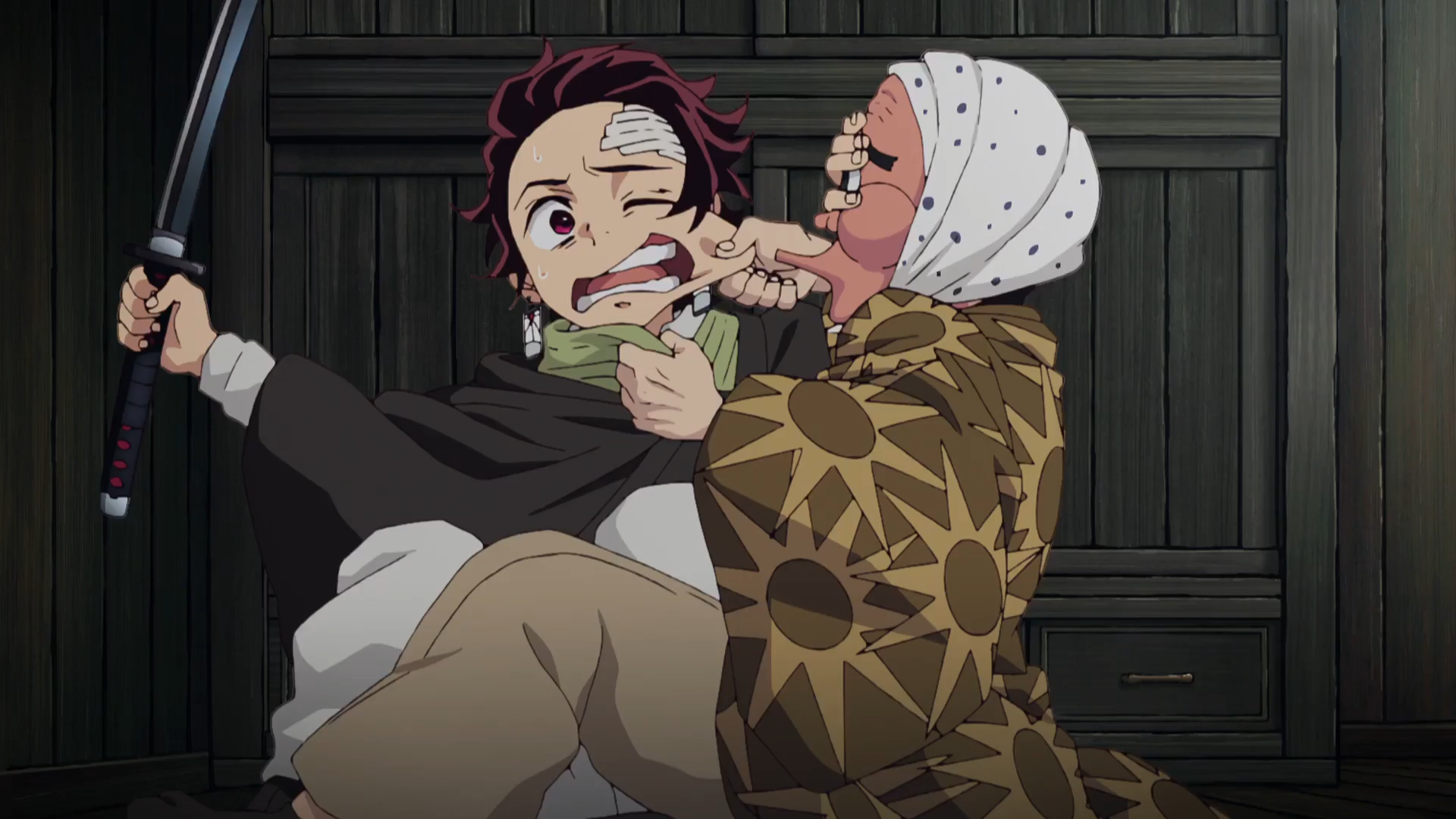 만신창이가 되어 우로코다키의 집으로 돌아온 탄지로. 그 순간, 긴 잠에 빠져있던 네즈코가 깨어나 문을 박차고 나옵니다. 두 남매의 재회, 그리고 가면 뒤로 눈물을 흘리며 두 아이를 꽉 끌어안는 스승 우로코다키의 모습은 1기 초반부 최고의 눈물 버튼입니다.