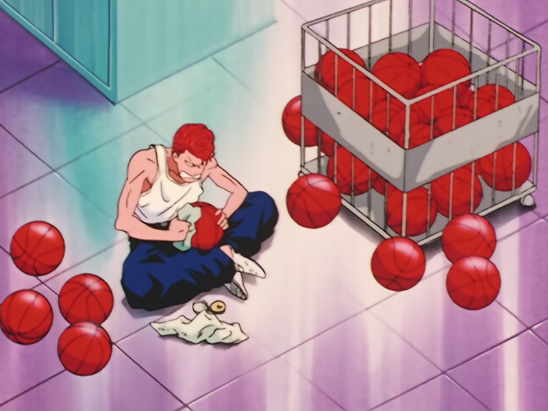무려 수백 개의 농구공 위에 자기 이름을 하나하나 적으며 꼬박 밤을 새운 사쿠라기. 하루코조차 "근성이 있네"라 인정할 정도의 집념입니다. 이것이 진정한 바스켓맨의 자질 - 재능이 아닌 '근성'의 시작입니다.