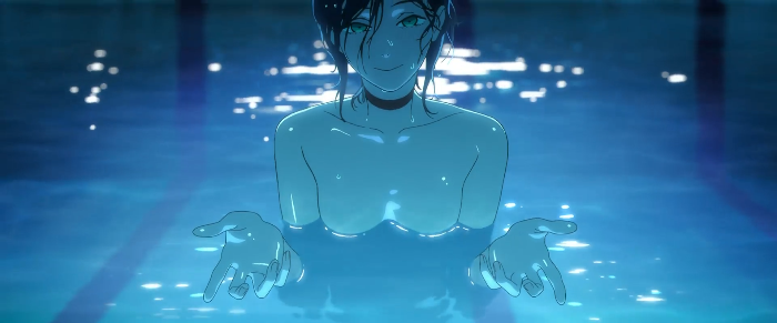극장판에서 가장 아름답고 인상 깊은 장면은 단연 학교 야간 수영장 씬입니다.